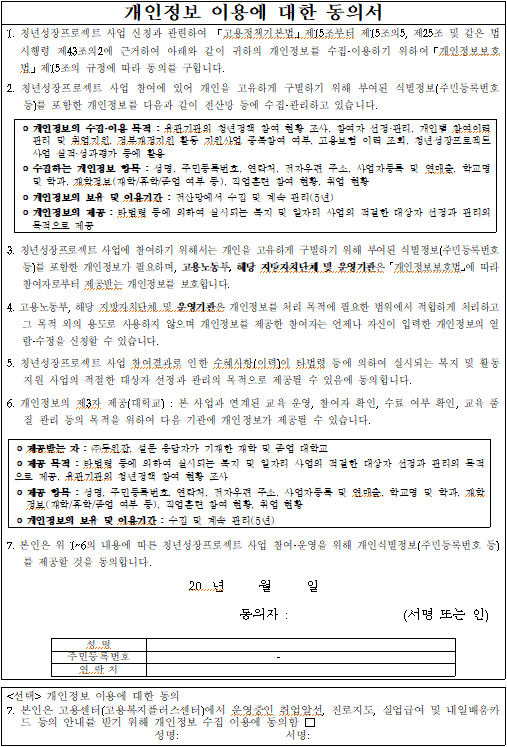 ◦ 개인정보의 수집·이용 목적 : 유관기관의 청년정책 참여 현황 조사, 참여자 선정·관리, 개인별 참여이력 관리 및 취업지원, 정부재정지원 활동 지원사업 중복참여 여부, 고용보험 이력 조회, 청년성장프로젝트 사업 실적·성과평가 등에 활용
